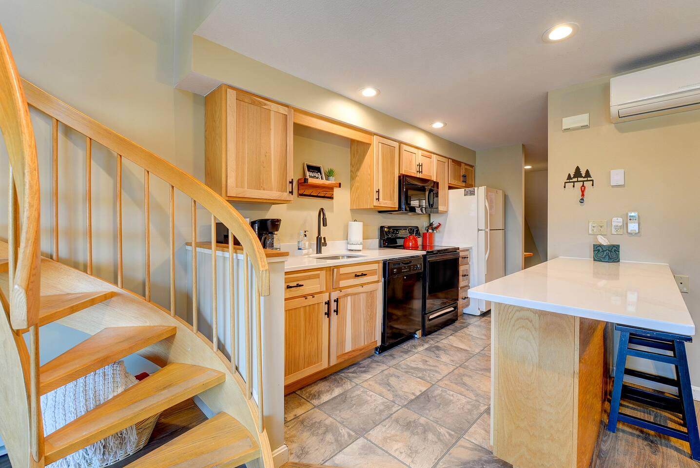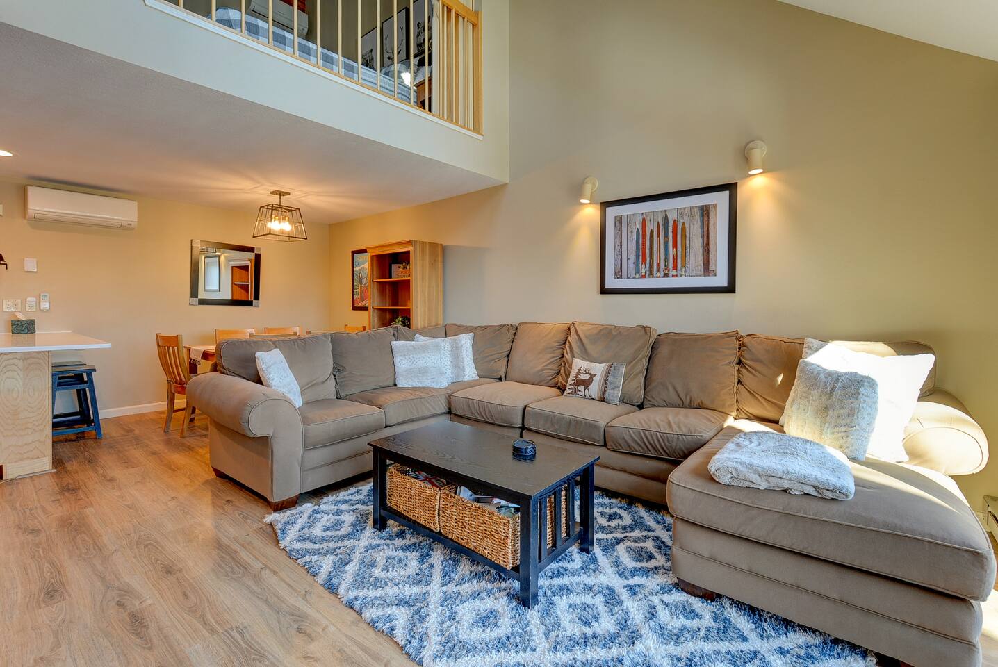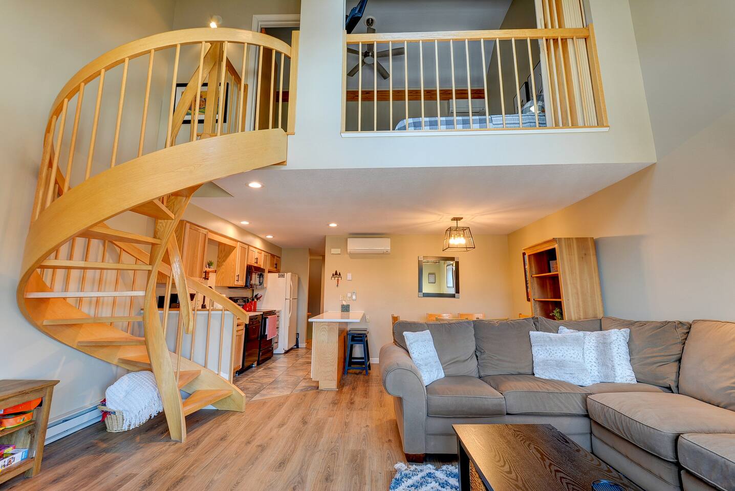 Looking for a comfortable vacation condo? Look no further! Our Nordic Village condo is the perfect getaway for you and your family or friends. With two bedrooms and two bathrooms, this 2-story unit features a spiral staircase, fireplace, and a deck that offers stunning views of the White Mountains. But the amenities don't stop there. Take advantage of the indoor and outdoor pools, hot tubs, and a sauna to relax and rejuvenate after a day of adventure. And when you're ready to hit the slopes, Attitash, Cranmore, Wildcat, and Black Mountain are all just a short drive away followed by a visit to North Conway downtown for shopping and a meal. But skiing isn't the only activity available in the area. White Mountain National Forest, with its breathtaking beauty, offers hiking, biking, and wildlife viewing opportunities. And, for those traveling with children, Story Land is just a mile away, where your little ones can enjoy rides, attractions, and shows. Back at the condo, there's plenty of room for everyone to relax and unwind. The living room boasts an extra-large sectional ensuring that everyone has a comfortable place to rest. The fully equipped kitchen allows you to whip up a delicious meal with ease, or you can take advantage of the many dining options in the area. After a long day of exploring, retreat to the balcony in the morning to sip your coffee and relish in the scenic views. And for ultimate relaxation, indulge in a soak in the Jacuzzi tub. Whether you're seeking adventure or relaxation, our Nordic Village condo has something for everyone. Book your stay today and experience the magic of the White Mountains!